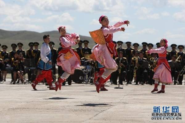 资料图:11年7月31日,在蒙古首都乌兰巴托,演员在军事演习开幕式现场表演精彩的蒙古国传统民族舞蹈。新华社记者石永春