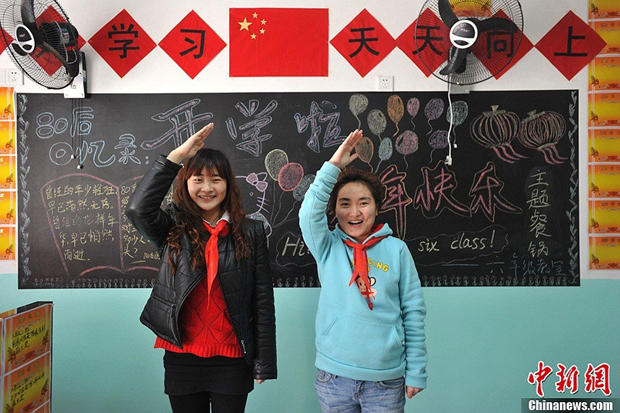 2月21日,重庆一家“80后的课堂”创意火锅店,店里工作人员戴着红领巾在黑板前行礼。