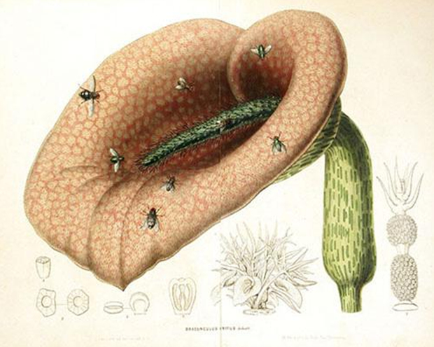苍蝇嗡嗡地围绕一种海芋植物周围并不是玩笑,它散发的恶臭气味非常像腐烂的动物尸体,其主要用途是吸引传粉者。在晴朗的天气中,这种恶臭气味将散布得更远。