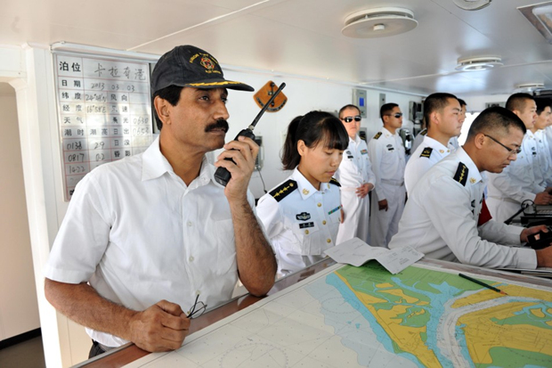巴方引水员登上“哈尔滨”舰指引中国军舰靠港