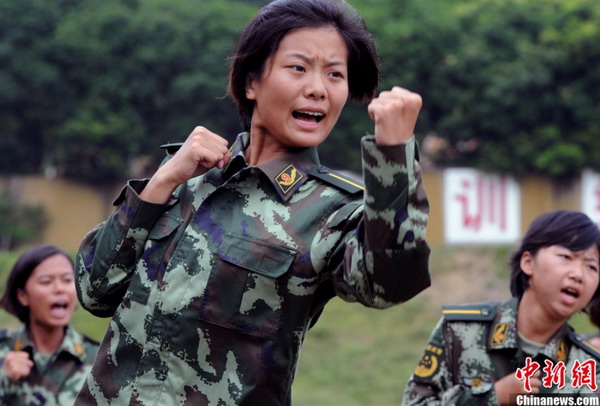 9月6日,福建省新入警女大学生、毕业于上海戏剧学院的皮岳与其他19名“90后”女大学生一起在福建省公安边防总队教导大队训练场训练。身高1.75米的皮岳被晒得黝黑、汗流浃背。此刻,很难让人把她与此前获得过的世界小姐上海赛区季军和华东六省舞蹈比赛表演金奖的“华丽”殊荣相联系在一起。8月初起,福建省公安边防总队2012年度入警大学生军事训练全面展开,206名参训学员是今年刚毕业的大学生,其中女学员20人,大多数是“90后。