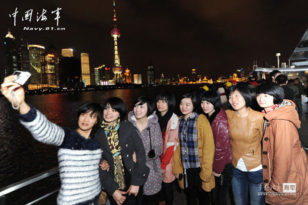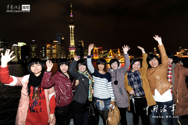 中国海军网:11月20日,东海舰队上海某水警区通信站即将退伍的女兵们在上海外滩合影留念。